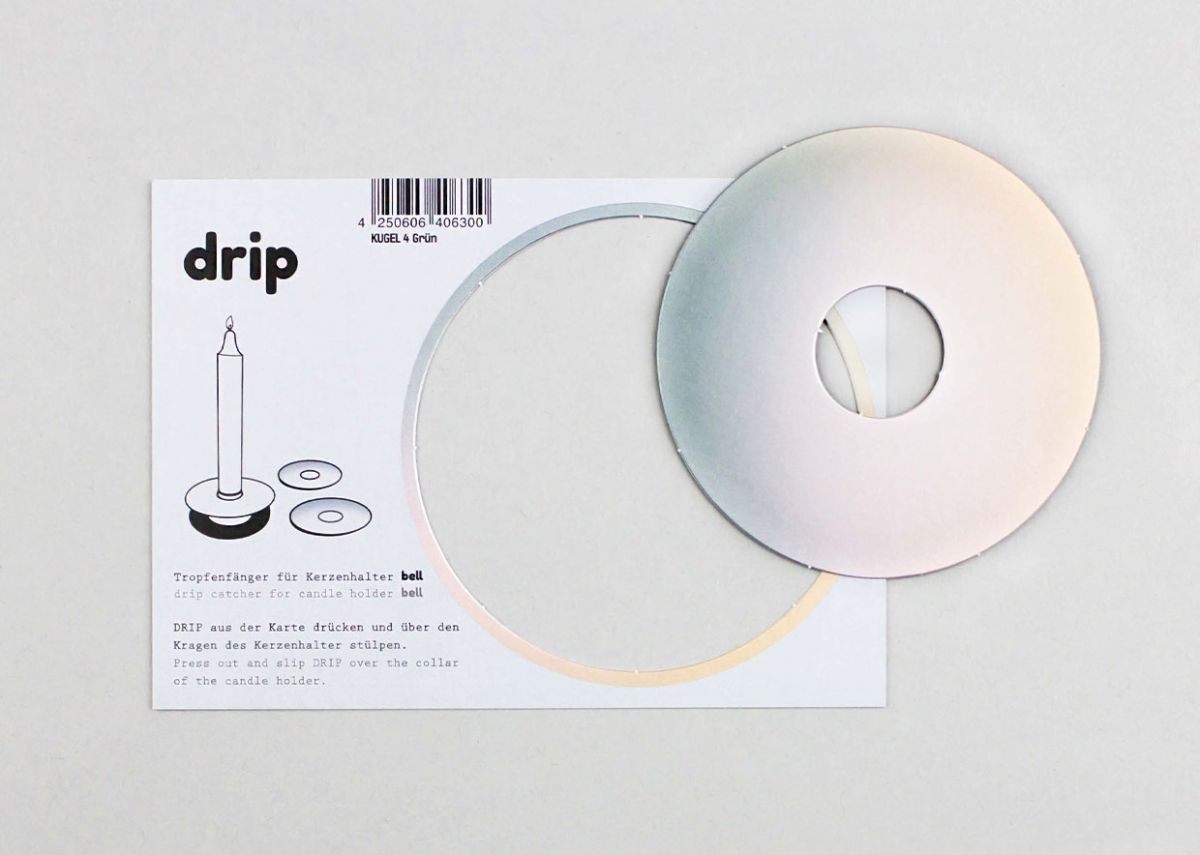 DRIP is a decorative drip catcher made from sturdy cardboard, shaped like a star, a sphere, a flower, or something similar. You place DRIP over the candle holder BELL, which is specifically designed in shape and size for DRIP. BELL makes DRIP float and protects it with its collar from the open flame.